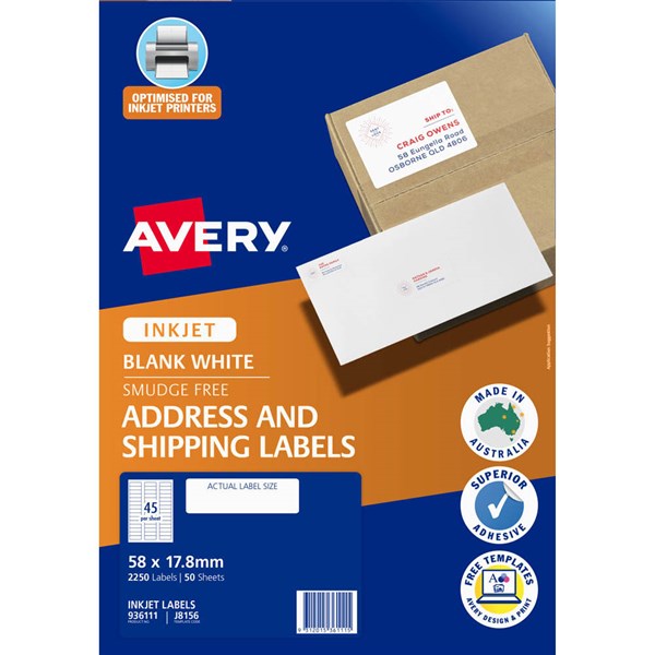 AVERY 936111 J8156 ADDRESS LABELS INKJET 45UP WHITE PACK 50