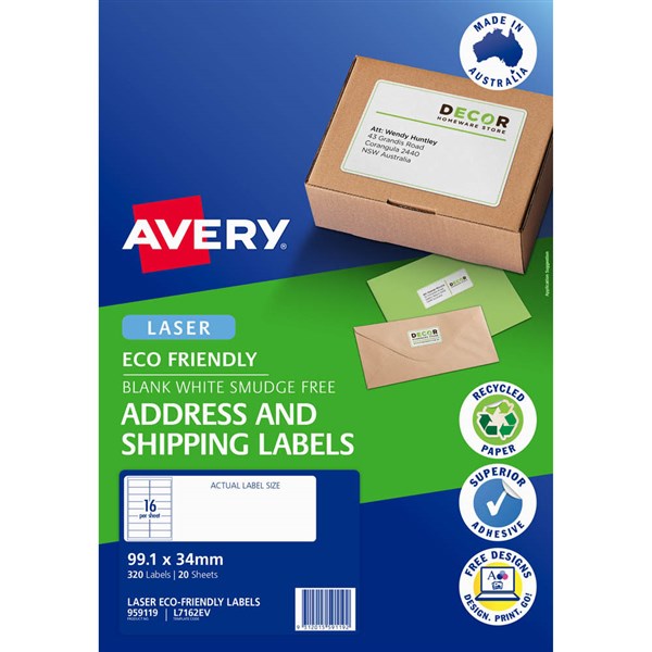 AVERY 959119 L7162EV ECO FRIENDLY LABELS LASER 16UP WHITE PACK 20