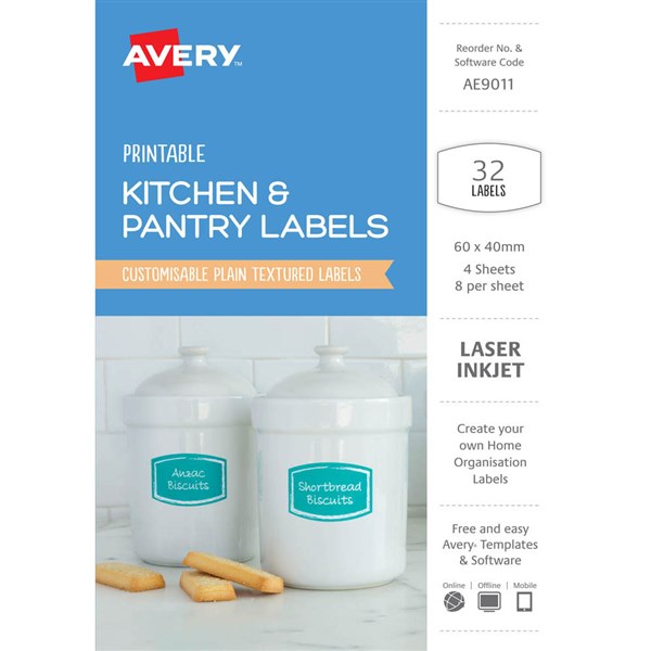 Create your own stylish and personalised organisation solutions with Avery textured white printable Kitchen and Pantry Labels