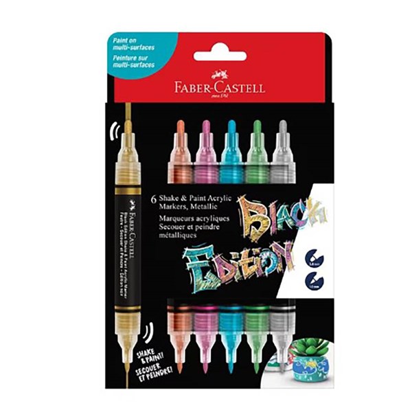Create bold and expressive marks on multiple surfaces with Faber-Castell black edition shake and paint acrylic markers