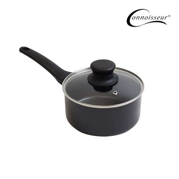 CONNOISSEUR PRESSED NON STICK SAUCEPAN WITH GLASS LID 160MM BLACK