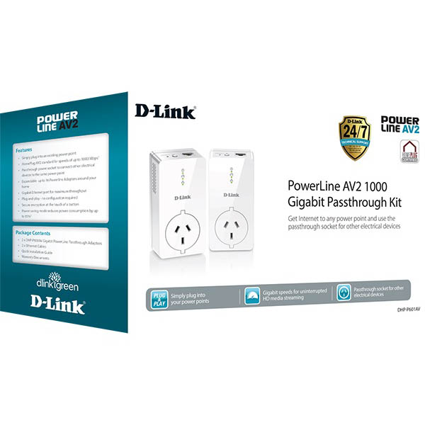 - The D-Link DHP-P601AV Adapters also feature an extra passthrough power socket to ensure that your electrical outlet remains available for use by another device while the PowerLine adapter is plugged into the socket