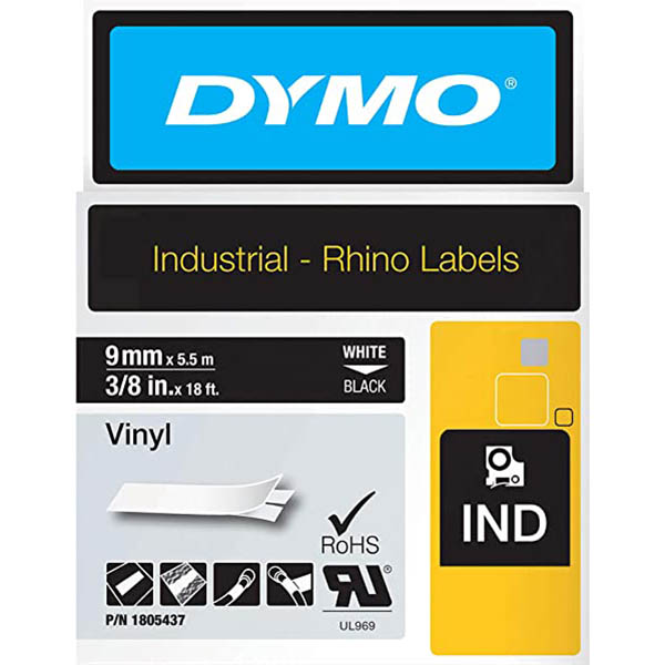 DYMO 1805437 RHINO INDUSTRIAL TAPE VINYL 9MM WHITE ON BLACK