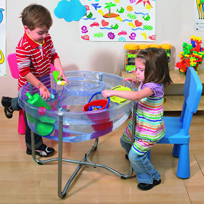 Circular sand and water tray is designed with multiple interior levels and slopes to allow children to explore many different activities