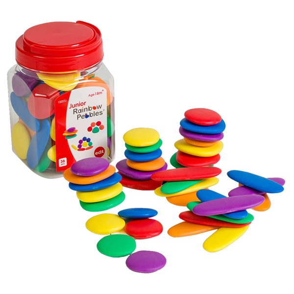 - Ideal for devoping fine motor skills, 3 shapes, 6 colours, 36 pebbles in a plastic jar