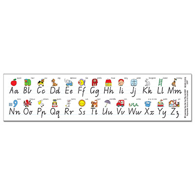 Classroom packs of 30 removable adhesive desk strips, showing both upper and lower case formations