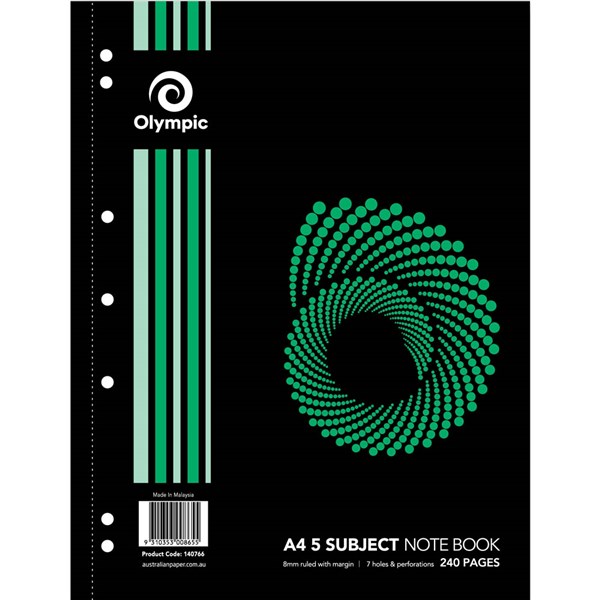OLYMPIC SL865 SPIRAL 5-SUBJECT NOTEBOOK 8MM RULED 240 PAGE 55GSM A4 PACK 5