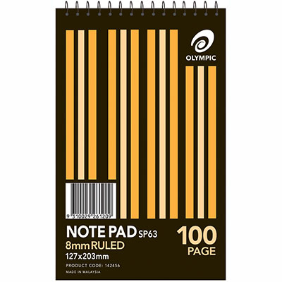 OLYMPIC SP63 NOTEPAD SPIRAL BOUND 8MM RULED 100 PAGE 127 X 203MM WHITE PACK 20