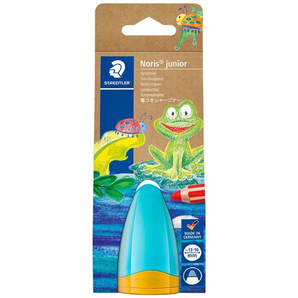 The Staedtler Noris Junior Tub Sharpener features a flat sharpening angle for thick, soft coloured strokes, so you can keep your favourite pencils ready for use