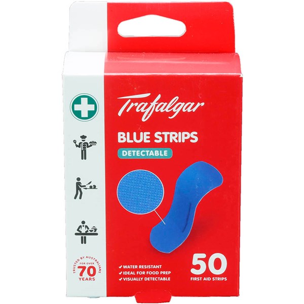 TRAFALGAR ADHESIVE DETECTABLE PLASTIC STRIPS BLUE PACK 50
