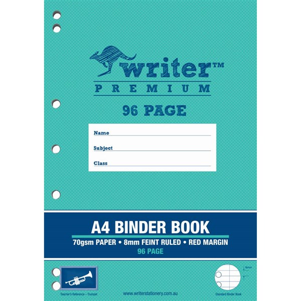 WRITER PREMIUM BINDER BOOK FEINT RULED 8MM 70GSM 96 PAGE A4 TRUMPET