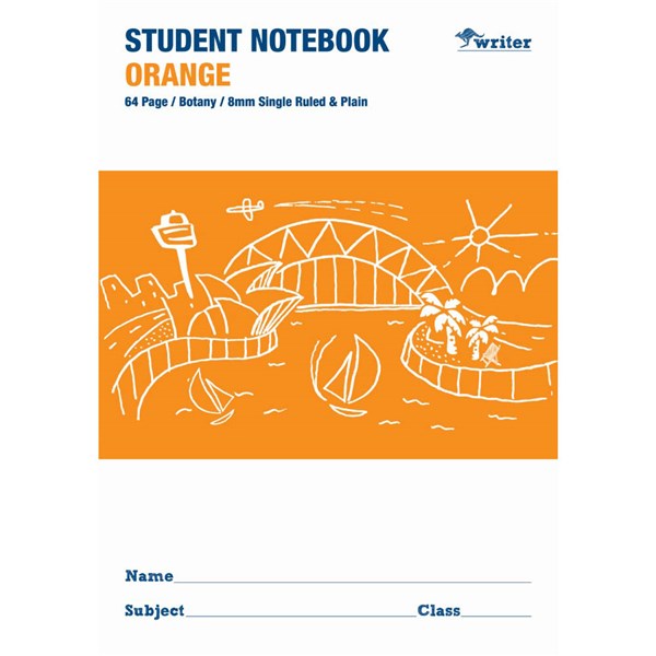 WRITER STUDENT NOTEBOOK PLAIN/SINGLE RULED 8MM 64 PAGE 250 X 175MM ORANGE
