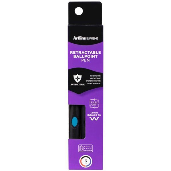 ARTLINE SUPREME ANTIMICROBIAL RETRACTABLE BALLPOINT PEN 1.0MM ASSORTED PACK 3