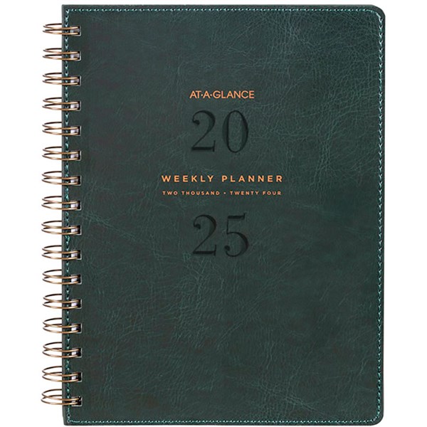The AT-A-GLANCE Signature planner range offers unique genderneutral cover material's paired with antique bronze twin wire binding to give a sophisticated look