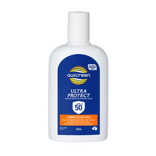 The Auscreen sunscreen lotion ultra protect SPF50+ has been formulated to provide high protection against the sun and harmful UVA and UVB rays