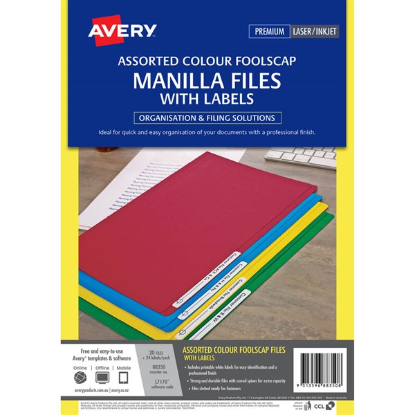 AVERY 88350 MANILLA FOLDER FOOLSCAP ASSORTED COLOURS WITH 24 LASER LABEL PACK 20