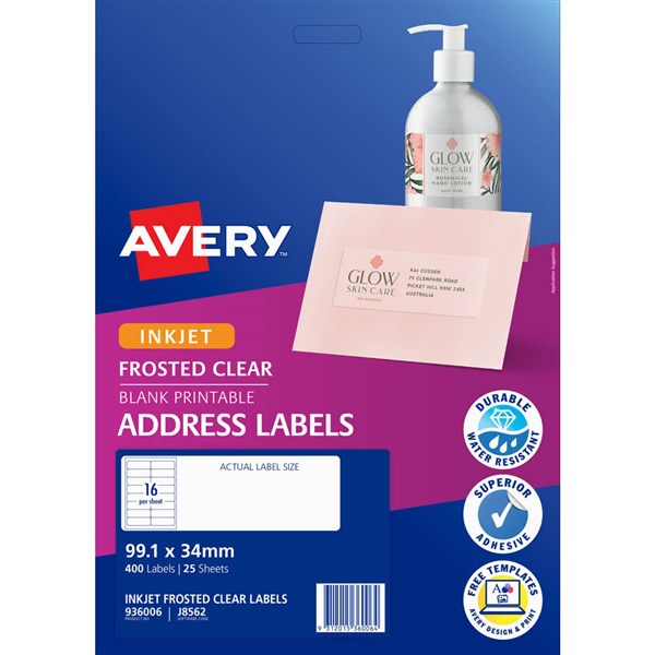 AVERY 936006 J8562 ADDRESS LABEL FROSTED CLEAR INKJET 16UP CLEAR PACK 25