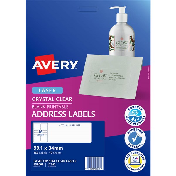 AVERY 958068 L7562 CRYSTAL CLEAR ADDRESS LABEL LASER CLEAR 16UP PACK 10