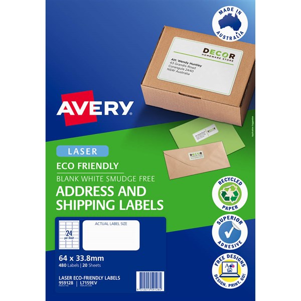 AVERY 959128 L7159EV ECO FRIENDLY LABELS LASER 24UP WHITE PACK 20
