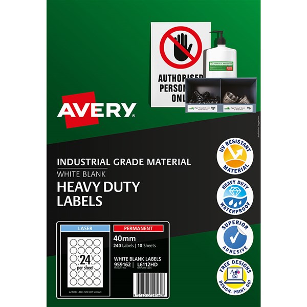 AVERY 959162 L6112HD MULTI-PURPOSE LABELS 40MM ROUND HEAVY DUTY WHITE PACK 240