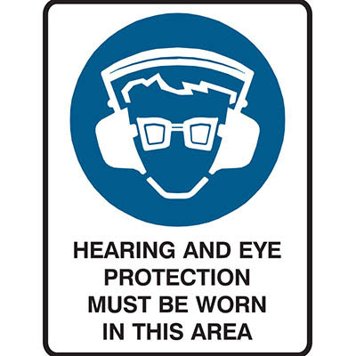 BRADY MANDATORY SIGN HEARING AND EYE PROTECTION MUST BE WORN IN THIS AREA 450 X 300MM POLYPROPYLENE