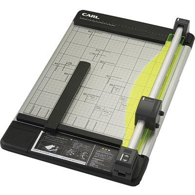 Carl trimmer features standard size paper markings to enable easy use, ergonomic design with magnetic paper size guide, rail mechanism to hold paper firmly in place and extra large cutting capacity