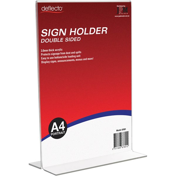 DEFLECTO BLUEPRINT SIGN HOLDER T-SHAPE DOUBLE SIDED PORTRAIT A4 CLEAR