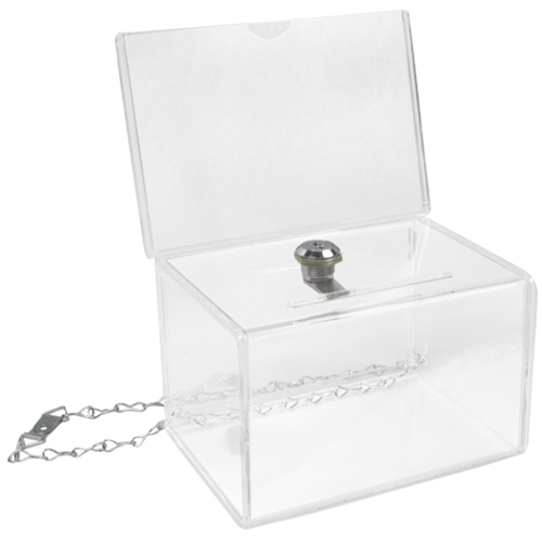 DEFLECTO DONATION BOX LOCKABLE WITH HEADER LANDSCAPE A6 CLEAR