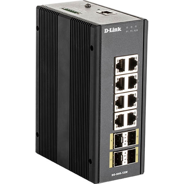 The D-Link DIS-300G-12SW Gigabit Industrial Managed Switch is equipped with 8 10/100/1000BASE-T ports and 4 SFP ports. The DGS-300G Series switches feature a robust design making them ideal for deployment in industrial and outdoor surveillance settings, capable of withstanding the harshest environments. The DIS-300G Series furthermore integrate advanced management and security functions to provide a complete solution