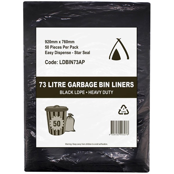 HUHTAMAKI LDPE BIN LINER 73 LITRE 920 X 760MM BLACK PACK 50