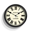 - A large railway station wall clock with a classic Roman numeral dial and gloss black metal case