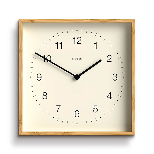 The Newgate Fiji Wall Clock - Mongoose Dial features a square bamboo case with a minimalist Scandi-inspired design and comes with three dial options