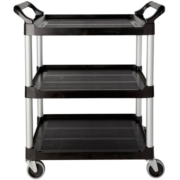 • This rolling utility cart can support up to 90kg and features easy-to-clean smooth surfaces, 100mm swivel castors for easy mobility, and user-friendly easy to grip handles