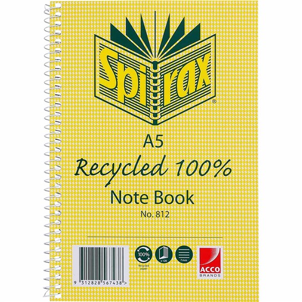 SPIRAX 812 NOTEBOOK 7MM RULED 100% RECYCLED CARDBOARD COVER SPIRAL BOUND A5 120 PAGE