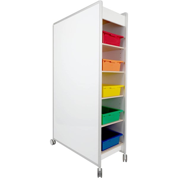 • Easily movable double sided magnetic whiteboard with storage that is split into two making it perfect for shared and adaptable learning environments. Each end has two adjustable shelves giving 8 compartments in total for storage