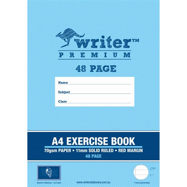 Writer Premium Exercise Books feature heavy duty covers, high quality white 70gsm paper with blue ruled lines and a red margin